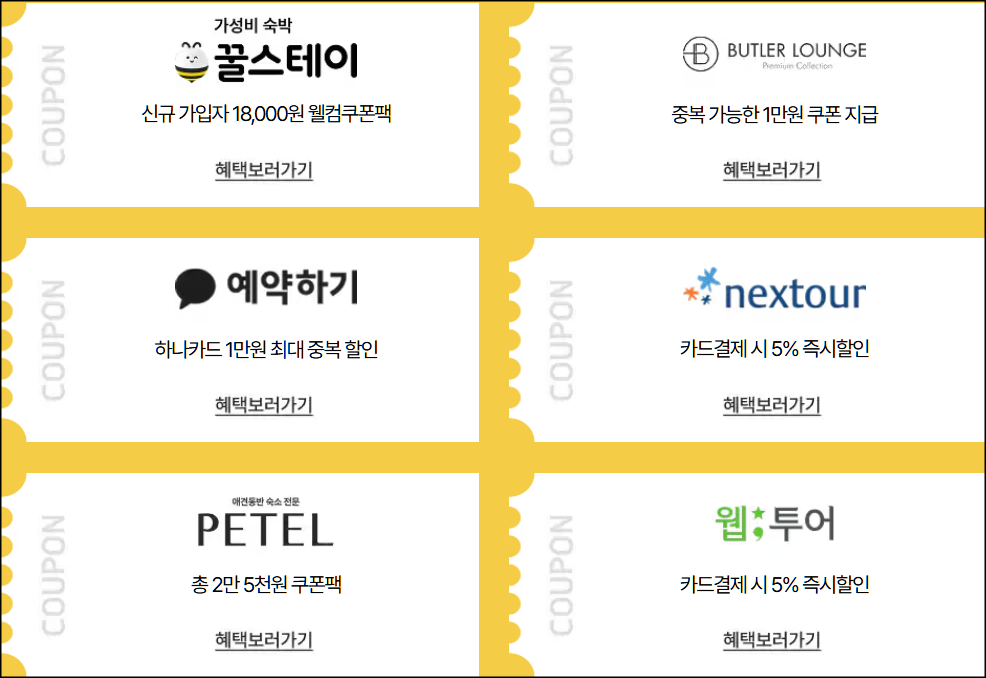 | 하나투어 | 숙박 금액별 할인 (2만~5만 원) + 숙소별 추가 할인 + 특가 이벤트 |