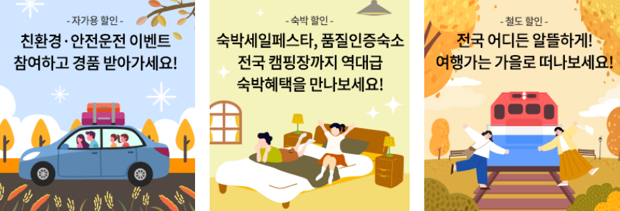“여행가는 가을” 캠페인은 크게 교통, 숙박, 여행상품/콘텐츠 부문으로 나눠 다채로운 할인과 프로그램을 제공합니다. 아래는 대표 혜택 정리입니다.