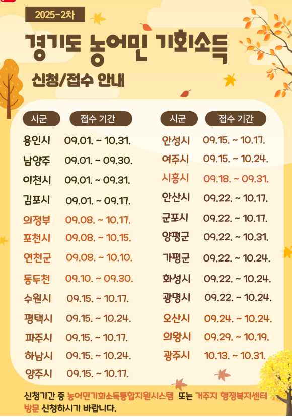 - 신청 기간: 2025년 9월 1일부터 10월 말까지, 시군별 일정에 따라 다름