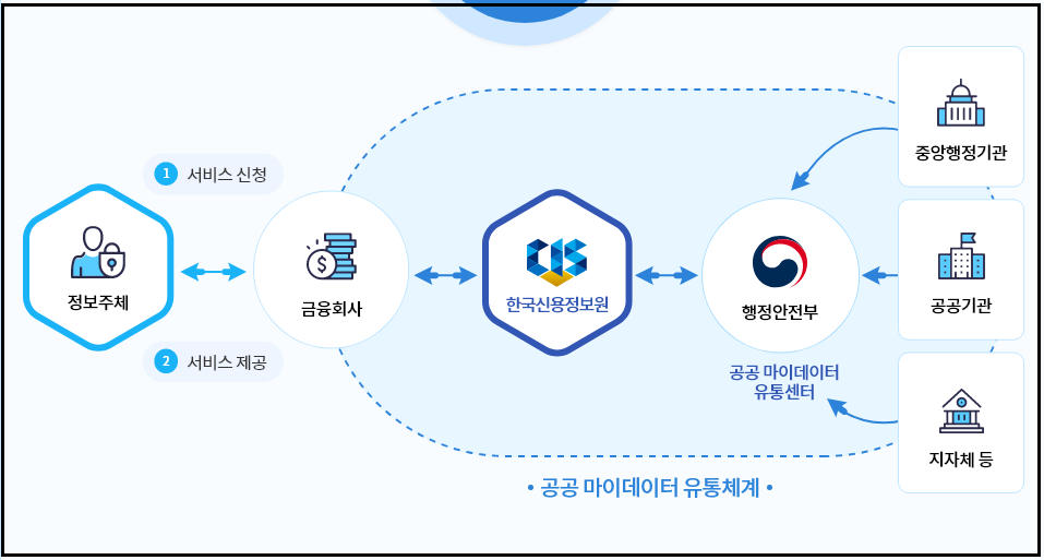 공공마이데이터는 국민이 행정·공공기관에 등록된 본인 행정정보(예: 주민등록, 가족관계, 세금, 건강보험, 졸업증명 등)를 데이터 형태로 요청하면, 필요한 기관이나 서비스에 전자적으로 제출 가능한 제도입니다.