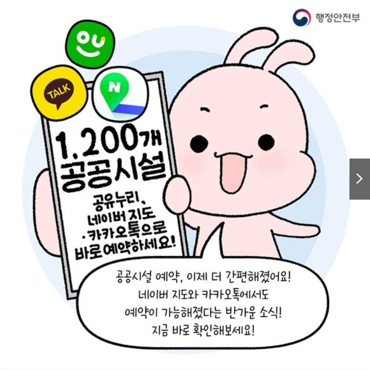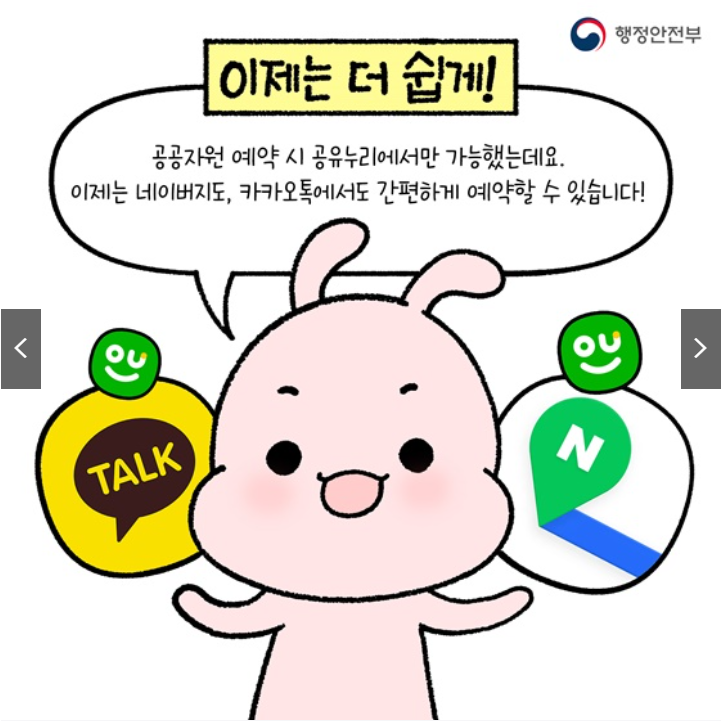 이러한 공공자원 예약 시 지금까지는 공유누리에서만 가능했는데요. 이제는 네이버지도, 카카오톡에서도 간편하게 예약할 수 있습니다.
