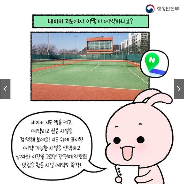 네이버 지도 앱에서 예약하고자 하는 시설 검색 → 지도 위에 표시된 예약 가능한 시설을 선택 → 날짜와 시간을 선택 → 예약완료.