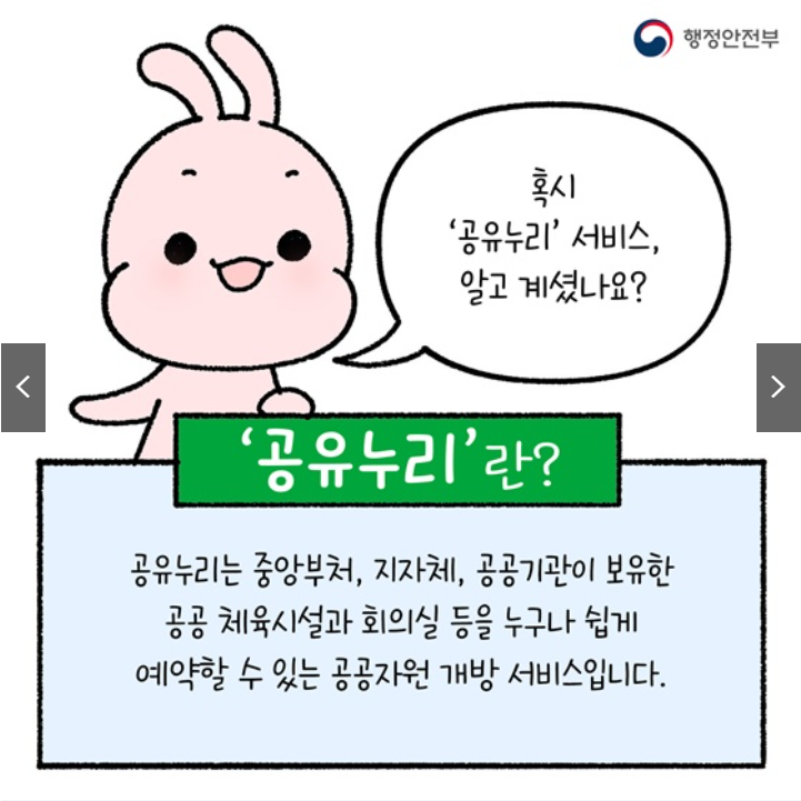 공유누리는 중앙부처, 지자체, 공공기관이 보유한 공공 체육시설과 회의실 등을 누구나 쉽게 예약하고 활용할 수 있는 공공자원 개방 서비스입니다.