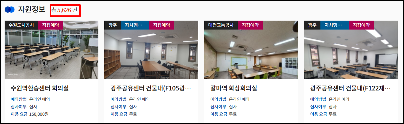 예약 가능한 시설은 다양합니다. 문화 ·숙박, 회의실, 강의실 ·강당, 체육시설, 주차장, 각종 물품(생활, 사무, 교통), 연구 ·실험장비, 교육 ·강좌 등 현재 등록되어 개수는 2025.6.7.현재 전국 약 150,000여개에 달합니다.