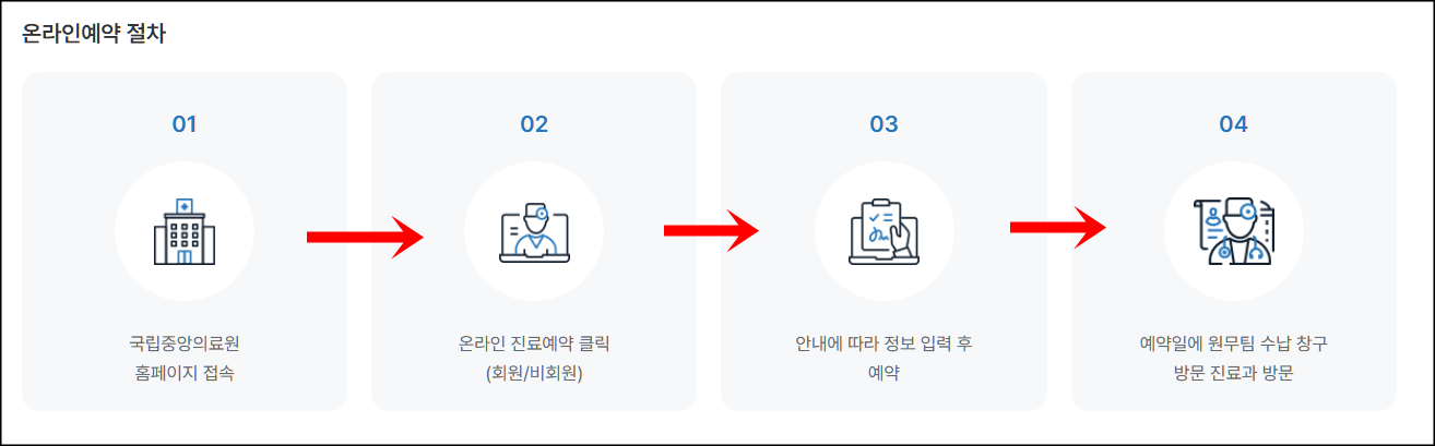 이제 국립중앙의료원을 방문하기 전, 홈페이지에서 손쉽게 진료 일정을 확인하고 예약까지 한 번에 처리할 수 있습니다. 특히 복잡했던 예약 절차 없이 비회원도 실명 인증(주민등록번호 확인)만으로 온라인 예약이 가능하여 누구나 쉽게 이용할 수 있습니다.