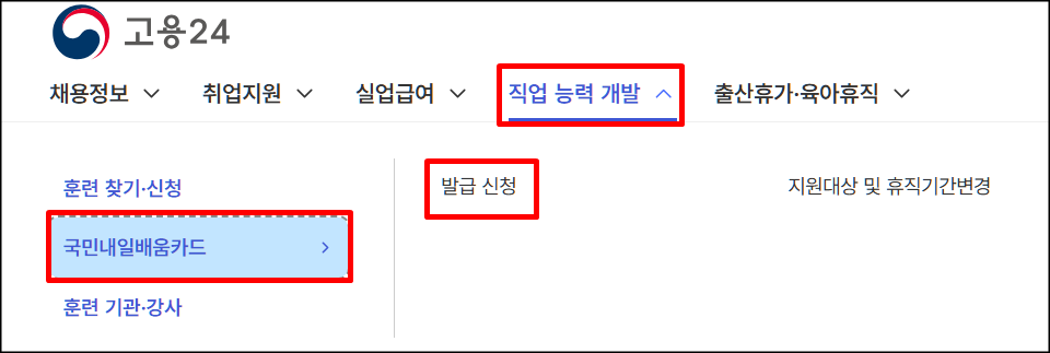 - 직업능력개발 → 국민내일배움카드 → ‘발급신청’ 클릭