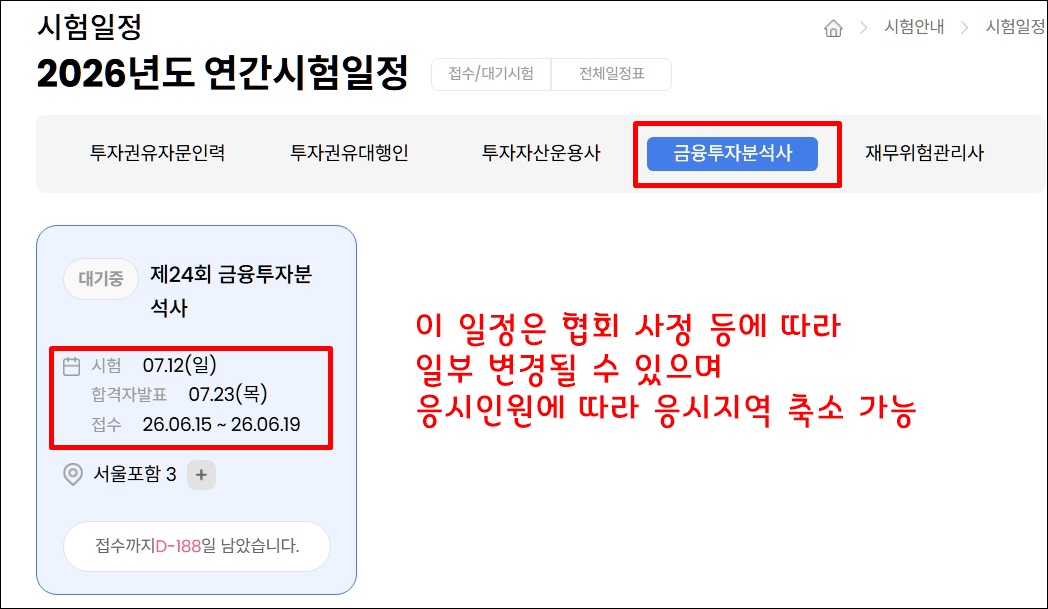 금융투자분석사는 통상적으로 1년에 딱 1회, 7월경에 시행됩니다. 기회가 적은 만큼 한 번에 붙는 전략이 중요합니다. 2026년도 시험은 다음과 같이 확정되었습니다.