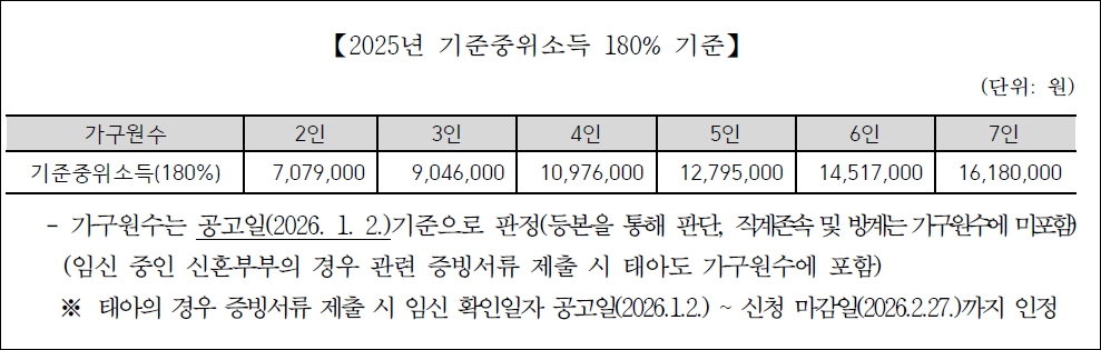 (2인 기준 월소득 707.9만원, 3인 기준 904.6만원 등)