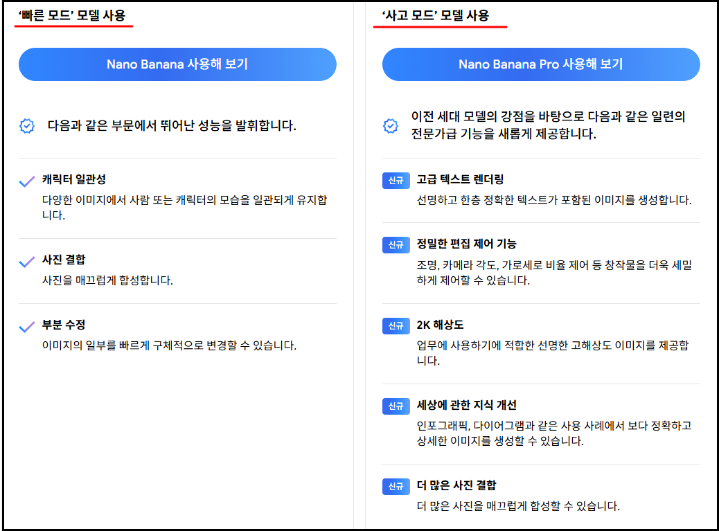 - 무료 사용자: 일일 할당량(약 5~10장) 내에서 무료로 체험해 볼 수 있으며, 할당량이 소진되면 일반 'Nano Banana' 모델로 전환될 수 있습니다.