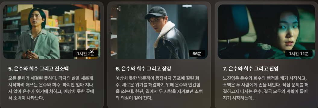 • 특징: 평범한 일상 속에서 무력감을 느끼던 인물입니다. 원작 소설의 '나오미'에 해당하며, 친구 희수를 돕기 위해 살인이라는 극단적인 계획에 동참합니다. 냉철한 판단력과 실행력을 보여주며 계획의 중심을 잡습니다.