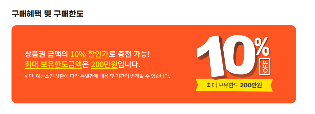 • 최대 10% 할인 혜택이 제공되며, 개인별 월간 구매 한도(보통 200만 원) 내에서만 구매가 가능합니다.