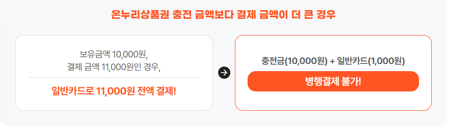 (예, 온리리상품권 보유금액 10,000원, 결제금액이 11,000원 경우 → 일반카드로 11,000원 결제되며 병행결제 불가)