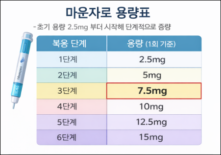 7.5mg은 보통 2단계 이상 복용 후 증가하는 중간 용량으로, 감량 효과가 본격적으로 나타나는 단계로 평가받고 있습니다.