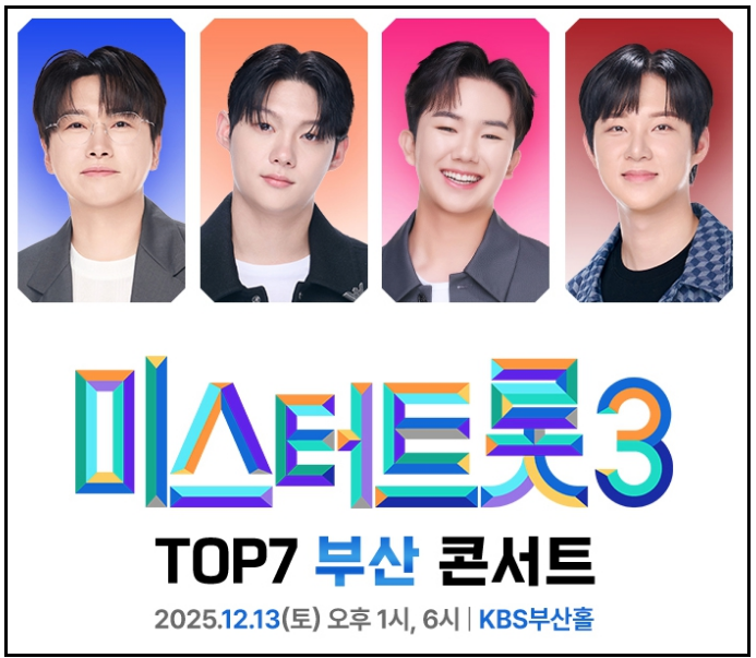 | 미스터트롯3 TOP7 부산 콘서트 │출연진, 티켓 예매, 좌석 정보 총정리(부산 KBS홀) (0) | 2025.11.24 |