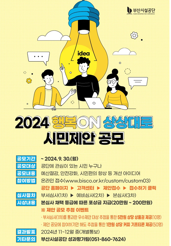 부산시설공단(이사장 이성림)은 오는 9월30일까지 공단과 관련한 시민 체감형 개선 아이디어를 공모한다고 밝혔다.