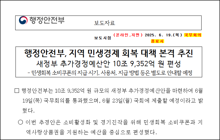 ◇ 지급 시기: 국회 추경 통과 시, 이르면 7월 초부터 지급 개시