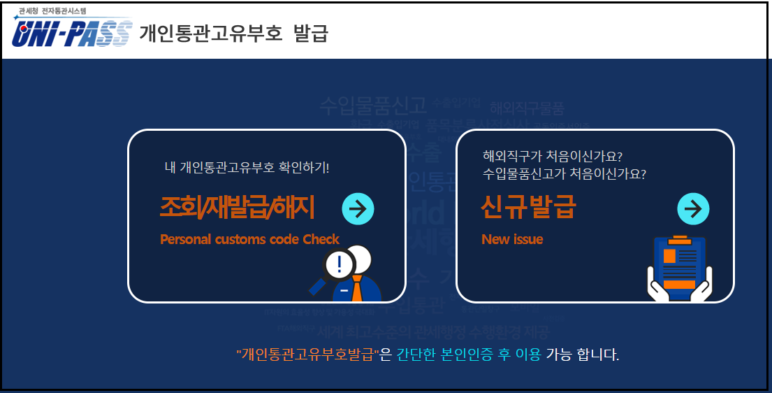 | 재발급(조회) 바로가기 | 개인통관고유부호 조회/신규발급 페이지 |