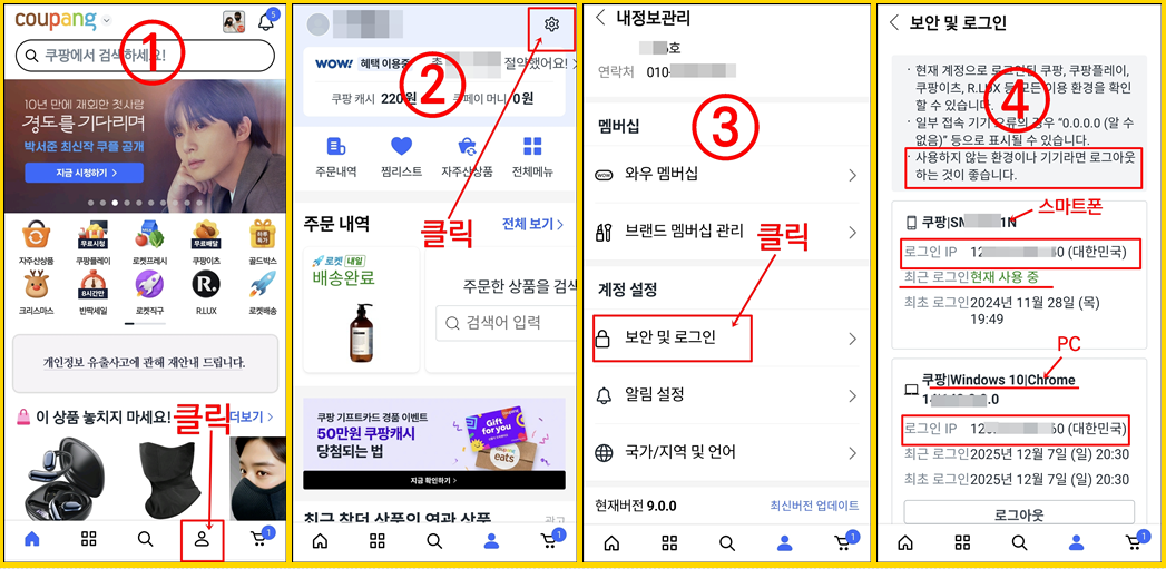 - 쿠팡앱에서 확인 : 하단 사람모양 → 상단 오른쪽 톱니바퀴 → 내정보관리 → 보안 및 로그인 확인 → 로그인 IP 확인 후 사용하지 않는 환경이나 기기라면 로그아웃