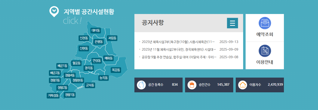 - 공공시설 예약 : 체육관, 축구장, 테니스장, 공연장 등 공공 체육·문화 시설 예약