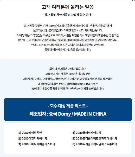 | 2080치약 회수·중국산 논란?리콜 대상 제품부터 환불 정보까지 총정리! (0) | 2026.01.09 |