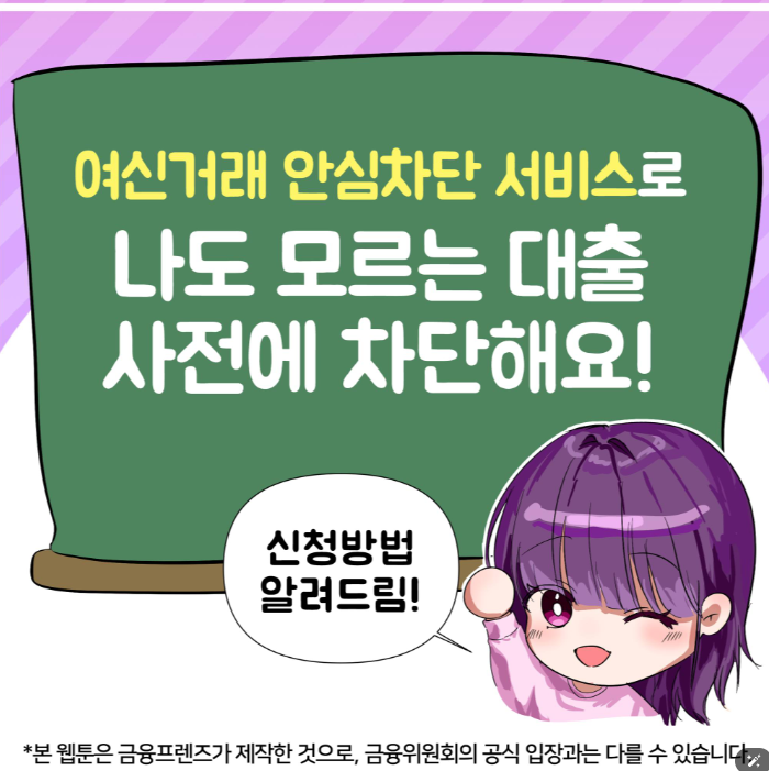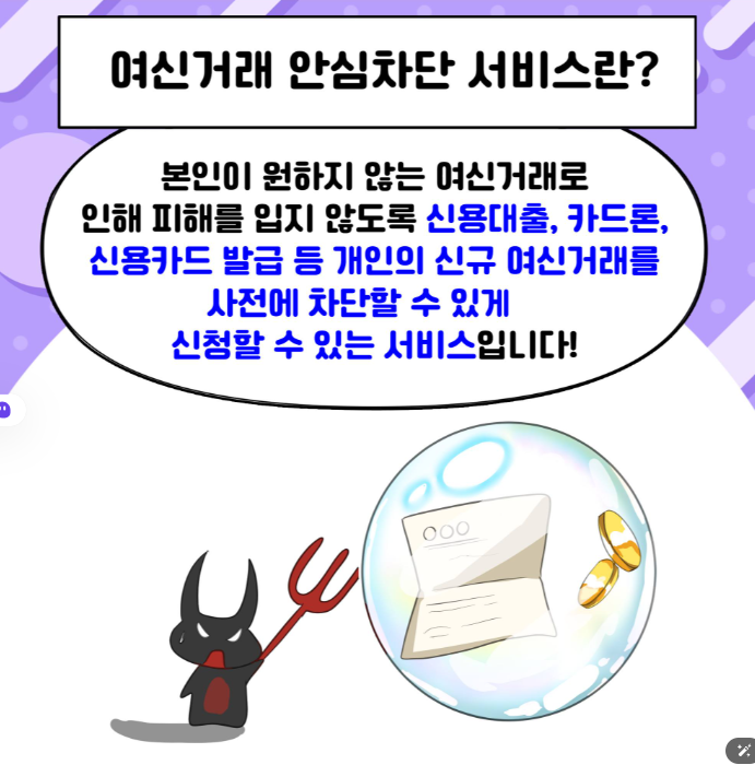 본인이 원하지 않는 여신거래로 인해 피해를 입지 않도록 신용대출, 카드론, 신용카드 발급 등 개인의 신규 여신거래를 사전에 차단할 수 있게 신청할 수 있는 서비스입니다. 금융사기 및 명의도용 피해를 예방하는 금융소비자 보호 서비스입니다.