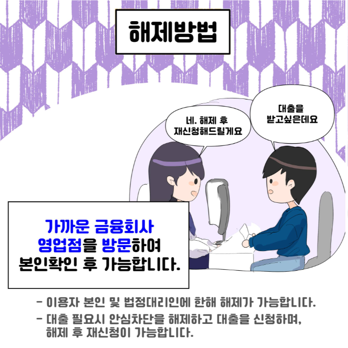 (비대면 신청은 일부 금융사에서만 제공). - 해제: 신청자가 금융회사 영업점을 방문해 본인 확인 후 해제 가능