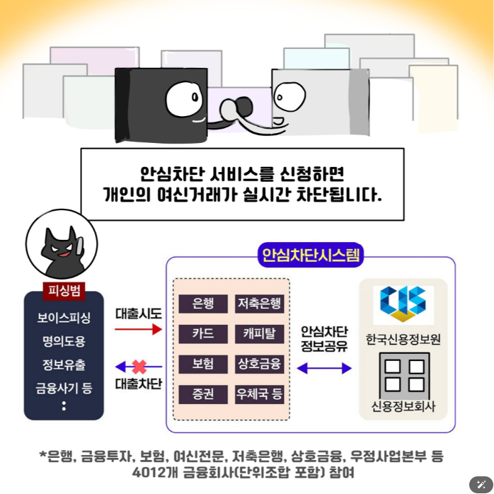 - 신청 즉시 차단 정보가 한국신용정보원에 등록되어 실시간 차단.