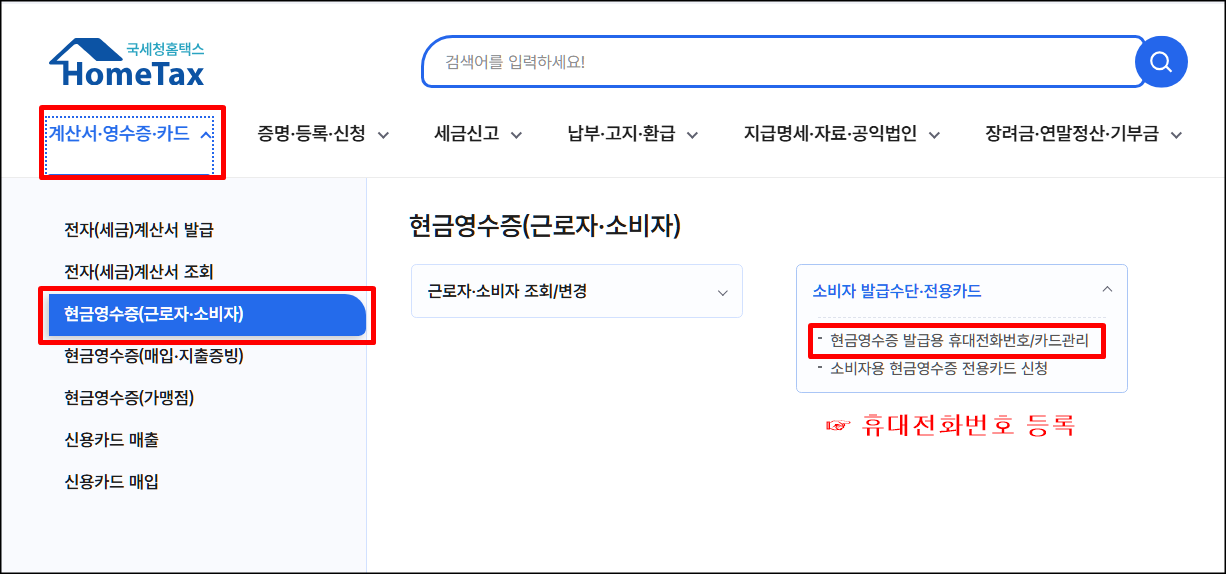 홈택스 > [계산서·영수증·카드] 메뉴에서 본인 명의 휴대폰 번호 등록