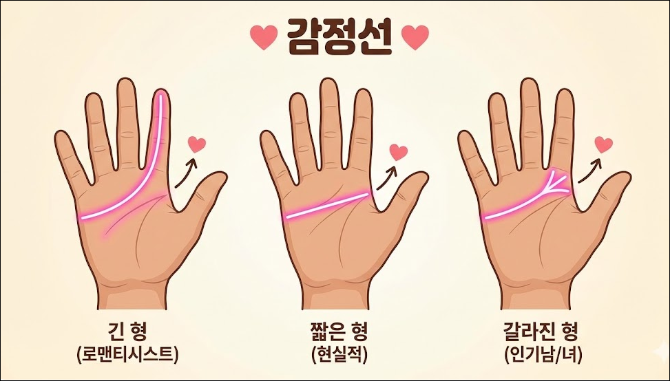 • 감정선에 가까울수록: 조혼(이른 결혼)을 할 가능성이 높습니다. (20대 초중반)