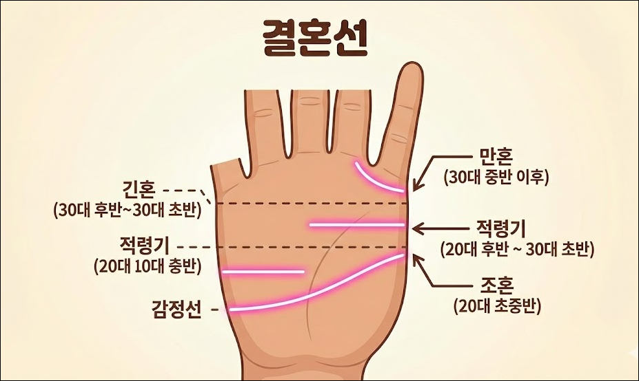 - 새끼손가락에 가까울수록: 만혼(늦은 결혼)을 의미합니다. (30대 중반 이후)