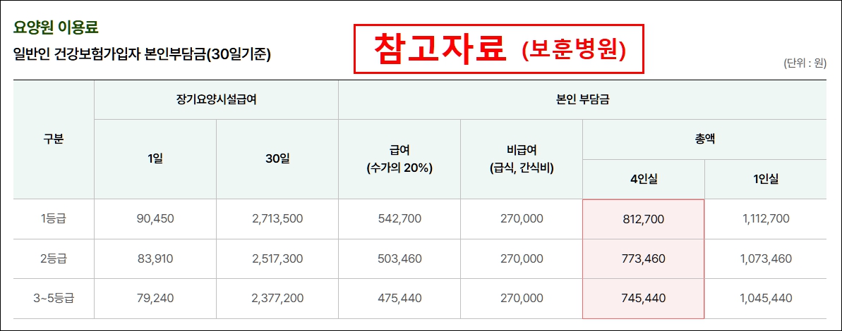 • 월 60~100만원 수준 (기본 4인실 기준, 중증도 낮은 경우)