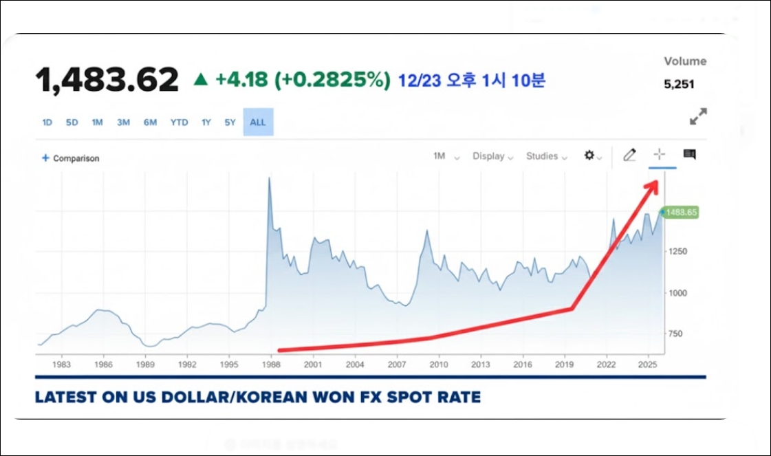 최근의 원화 약세 현상을 한 마디로 정리하면 미국의 고금리와 글로벌 달러 강세 속에서 한국 경제의 둔화와 자본 유출이 겹치며 환율이 상승하고 있는 상황입니다.