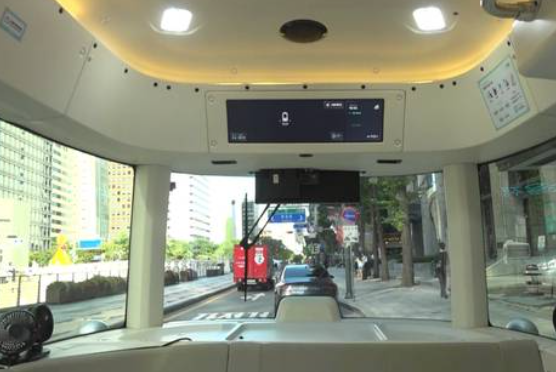 이 셔틀은 운전석이 없으며, 실내는 라운지처럼 'ㄷ'자형 좌석으로 꾸며져 있습니다. 또한 대형 디스플레이를 통해 자율주행 상태와 운행 정보를 확인할 수 있으며, 측면에는 휠체어 탑승 리프트도 장착되어 있습니다.