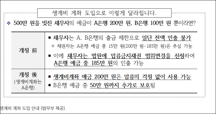 내년 2월부터 시행 예정인 전국민 압류방지 통장인 생계비계좌는 아래 3가지가 핵심입니다.