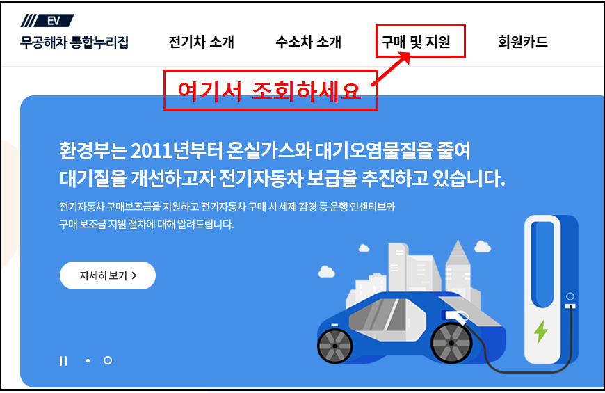 - 먼저 환경부가 운영하는 무공해차 통합누리집(www.ev.or.kr) 접속 → 상단 메뉴 ‘구매 및 지원' 탭