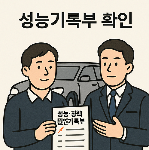 - 중고차를 구매할 때는 반드시 성능점검기록부를 확인해야 합니다. 사고 이력, 교환 부위, 주행거리 등을 알 수 있어 사기를 예방할 수 있습니다.