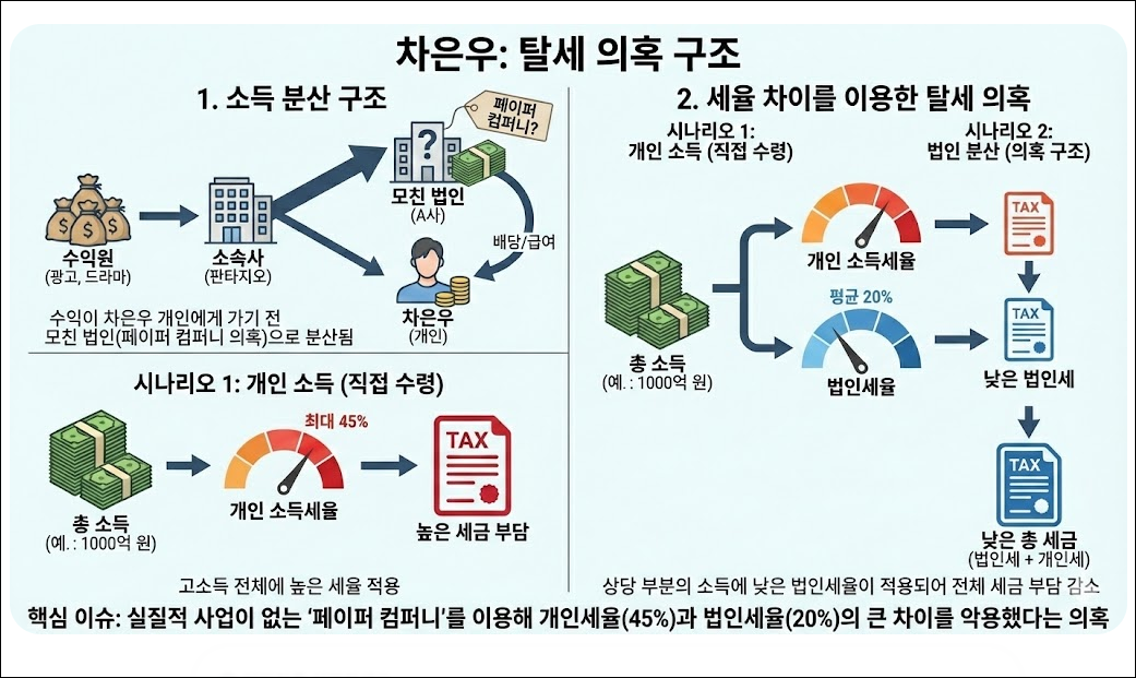 국세청이 차은우 씨에게 거액의 추징금을 부과한 이유는 '가족 법인을 통한 소득 분산' 때문입니다.