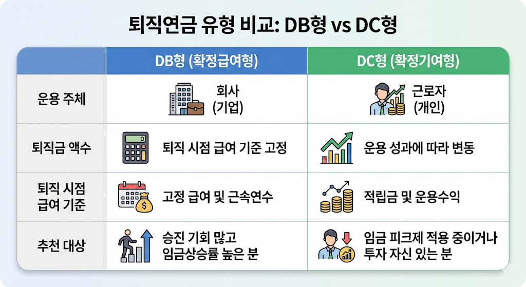 이러한 퇴직금 DB DC 차이를 제대로 모르면, 임금 상승률이 높은데도 DC형을 선택하거나, 투자 수익률이 좋은데 DB형에 묶여 손해를 볼 수 있습니다.