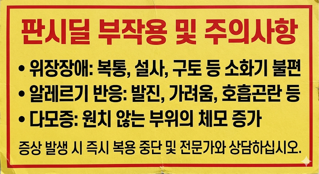 - 알레르기 반응: 드물게 발진이나 가려움증 같은 판시딜 부작용이 나타난다면 즉시 복용을 중단해야 합니다.