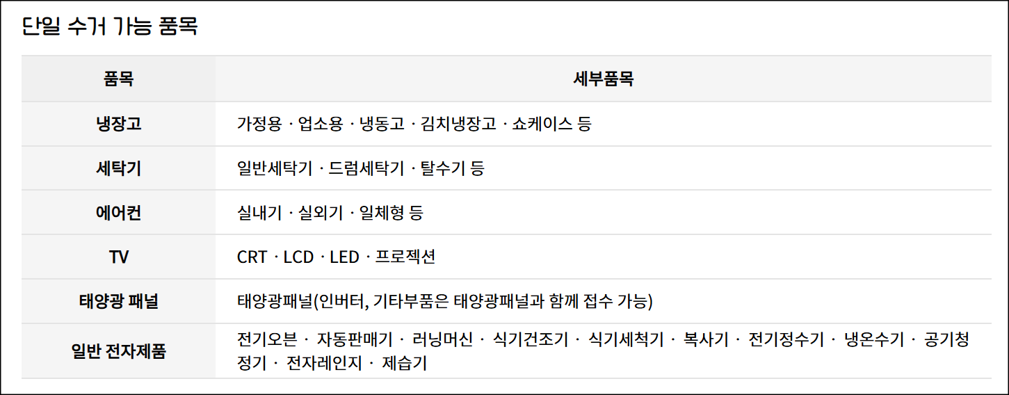 폐가전 방문수거 대상 제품은 단일 수거 가능품목, 세트 수거 가능품목, 다량 배출 가능품목으로 나누며, 냉장고 세탁기 등 원형이 훼손된 제품이나 폐가구, 악기류 등 방문 수거가 불가능한 제품도 있습니다. (아래 표 참조)