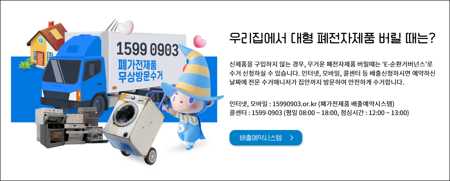 - 온라인 예약: 폐가전 방문수거 배출예약시스템 접속 후 예약 신청