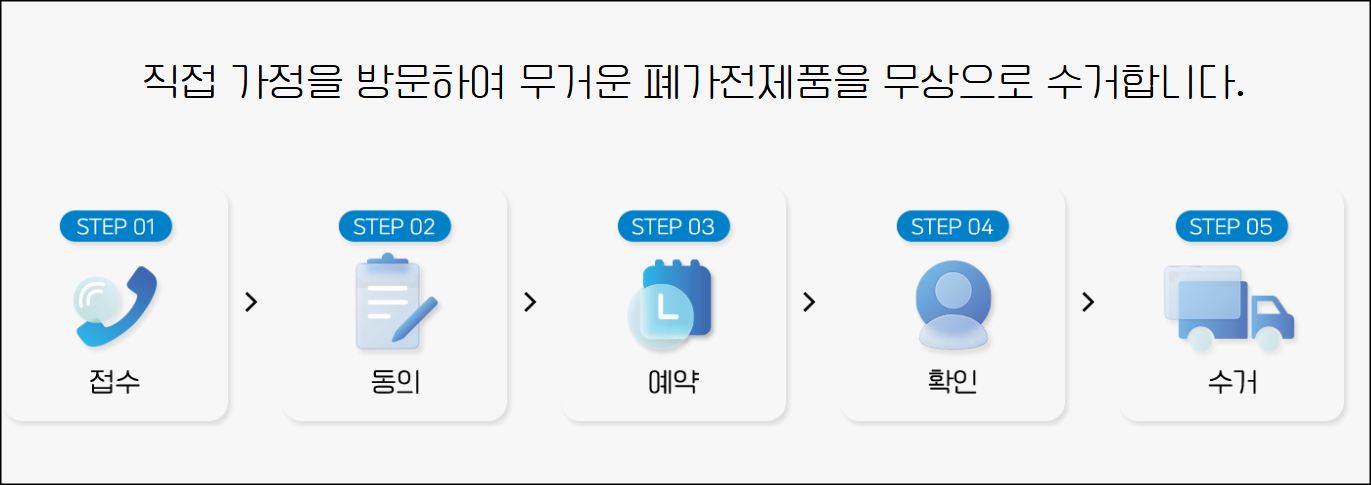 - 소형 가전 5개 미만은 수거 대상이 아니므로 주민센터나 재활용센터 이용 권장