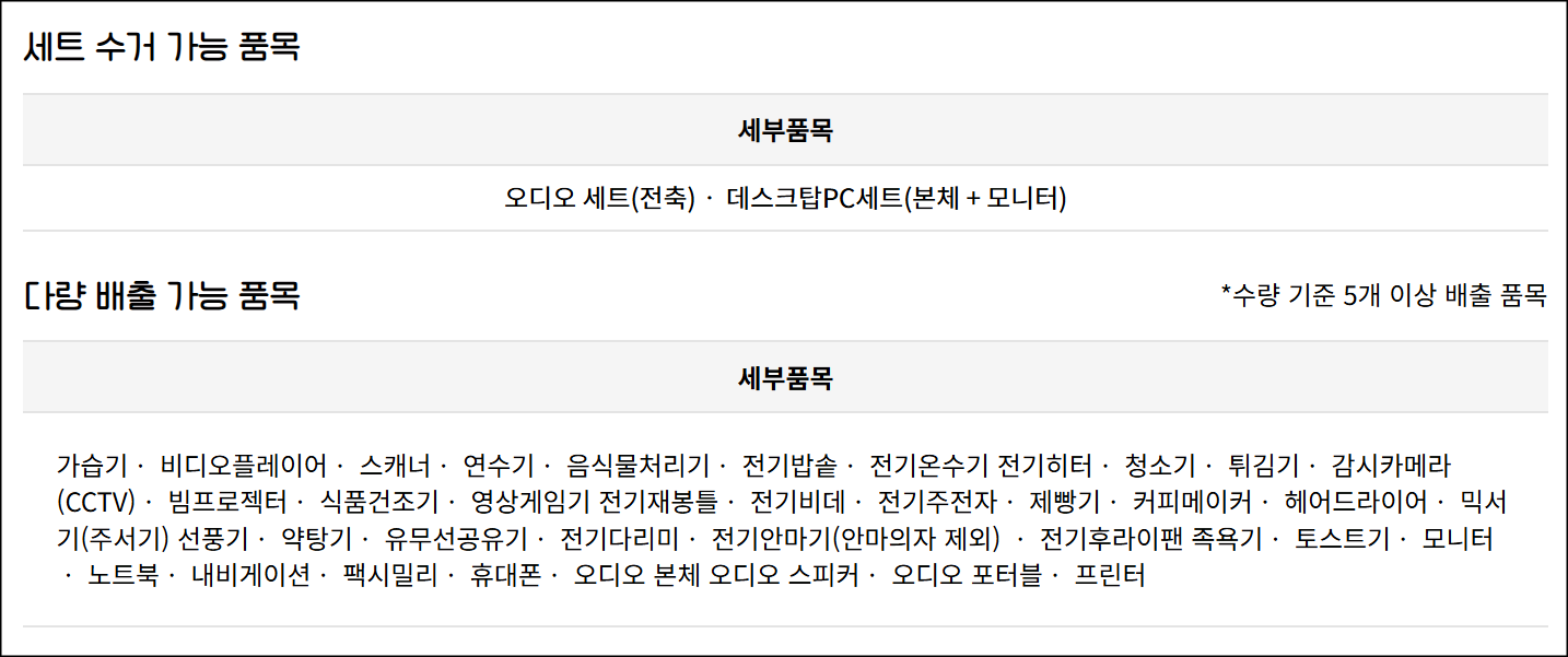 - 소형 가전제품: 5개 이상일 경우 수거 가능 (예: 믹서기, 청소기 등)