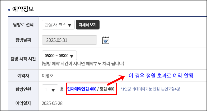 - 탐방객 정보 중복입력시 관리자의 직권으로 예약이 취소될 수 있습니다.
