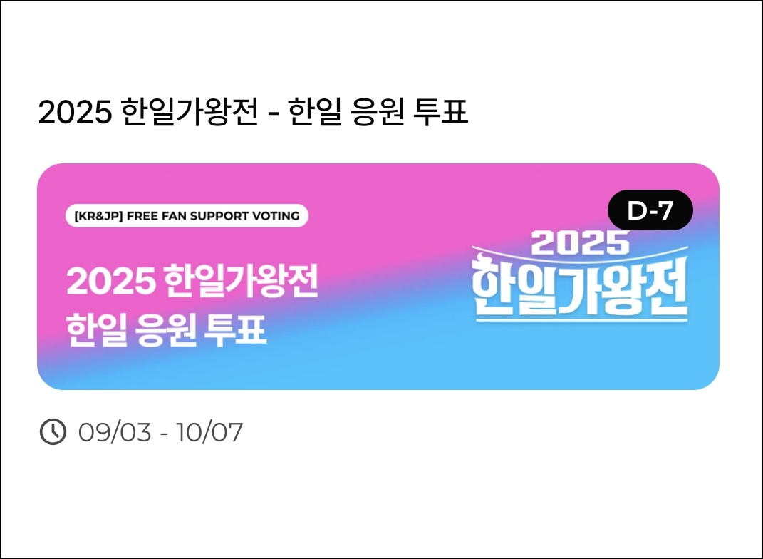 - 투표 메뉴 진입 : 앱 실행 후 ‘2025 한일가왕전 시즌2’ 메뉴를 선택합니다.