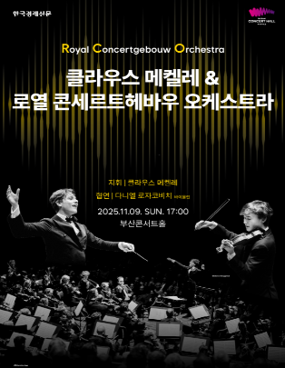 • 11월 9일 (일) 클래식부산 월드시리즈 - 클라우스 메켈레 & 로열콘세르트헤바우오케스트라 내한 공연 (콘서트홀): 차세대 거장 클라우스 메켈레와 세계 최정상급 로열 콘세르트헤바우 오케스트라의 만남! 명실상부 최고의 오케스트라 사운드를 직접 경험할 수 있습니다.