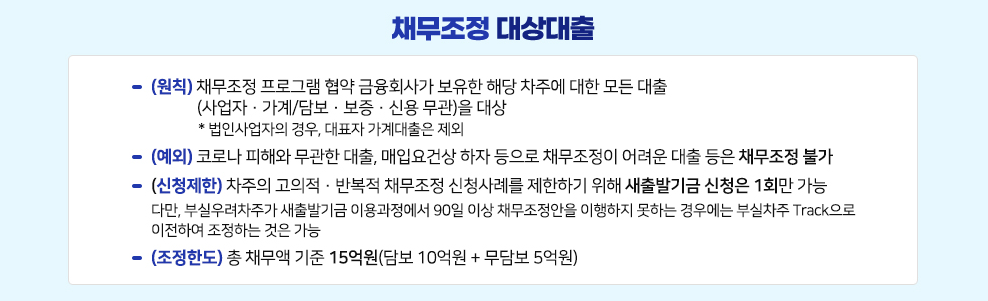 | 대상 채무 | 새출발기금 협약 금융기관의 총 채무액 | 15억 원 이하 (담보 10억, 무담보 5억 원 한도) |
