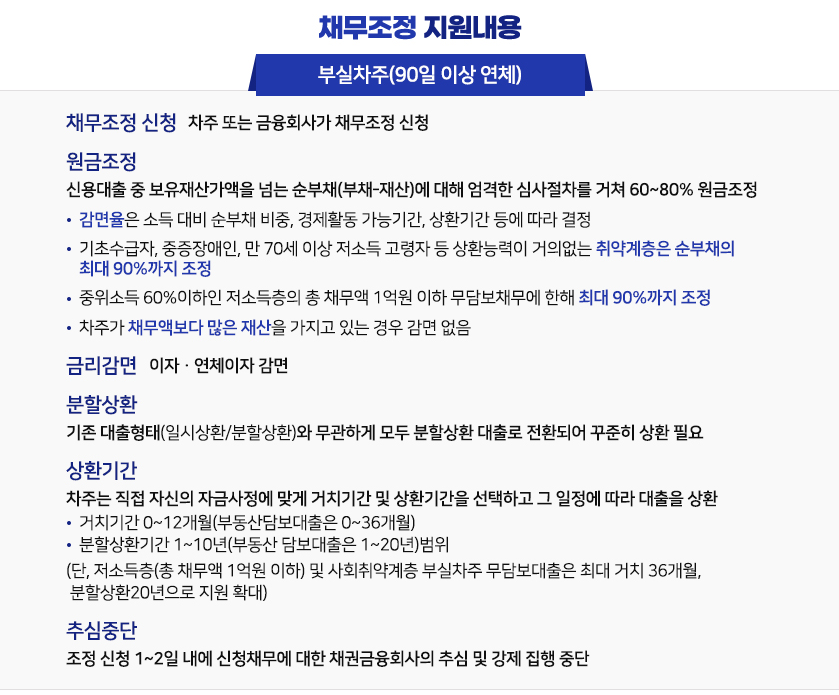 | 부실차주 | 원금 조정: 순부채(보유재산가액 초과분)에 대해 60~80% 원금 감면 (취약계층 최대 90%) | 상환기간: 거치기간(최대 3년), 분할상환(최대 20년) | |