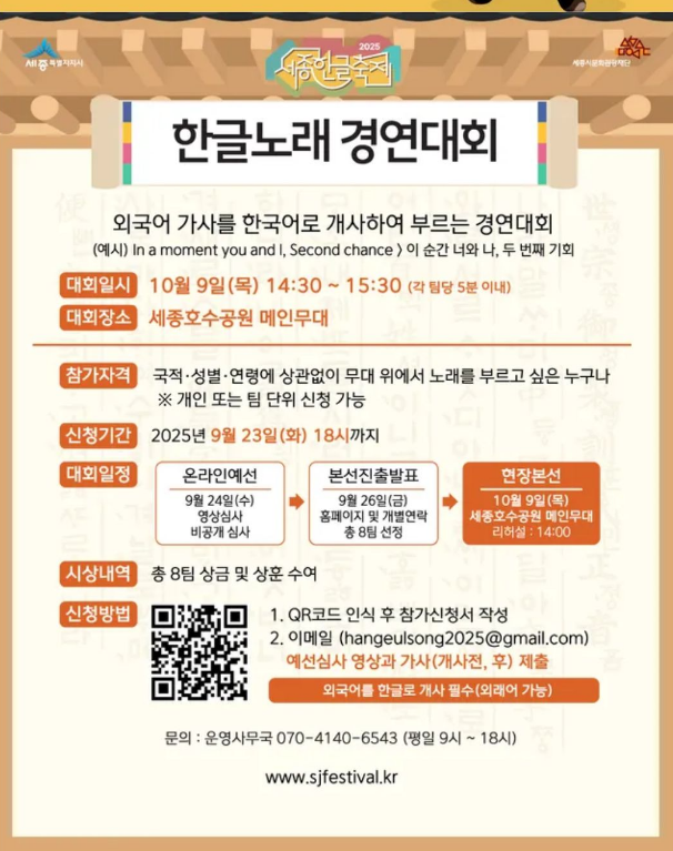 👉 신청 마감일은 9월 23일 오후 6시이니, 참가를 원한다면 지금 바로 신청서를 작성하고 영상을 준비하시기 바랍니다. 한글날, 세종호수공원 무대에서 여러분의 노래가 울려 퍼질 수 있습니다.