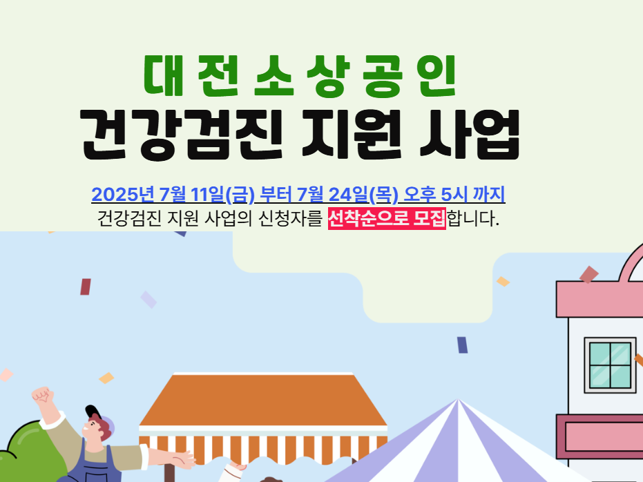 소상공인의 안정적인 영업환경 조성 및 건강한 삶 제고를 위해 "2025년 대전시 소상공인 건강검진(추가모집) 지원사업"을 다음과 같이 선착순으로 모집합니다.